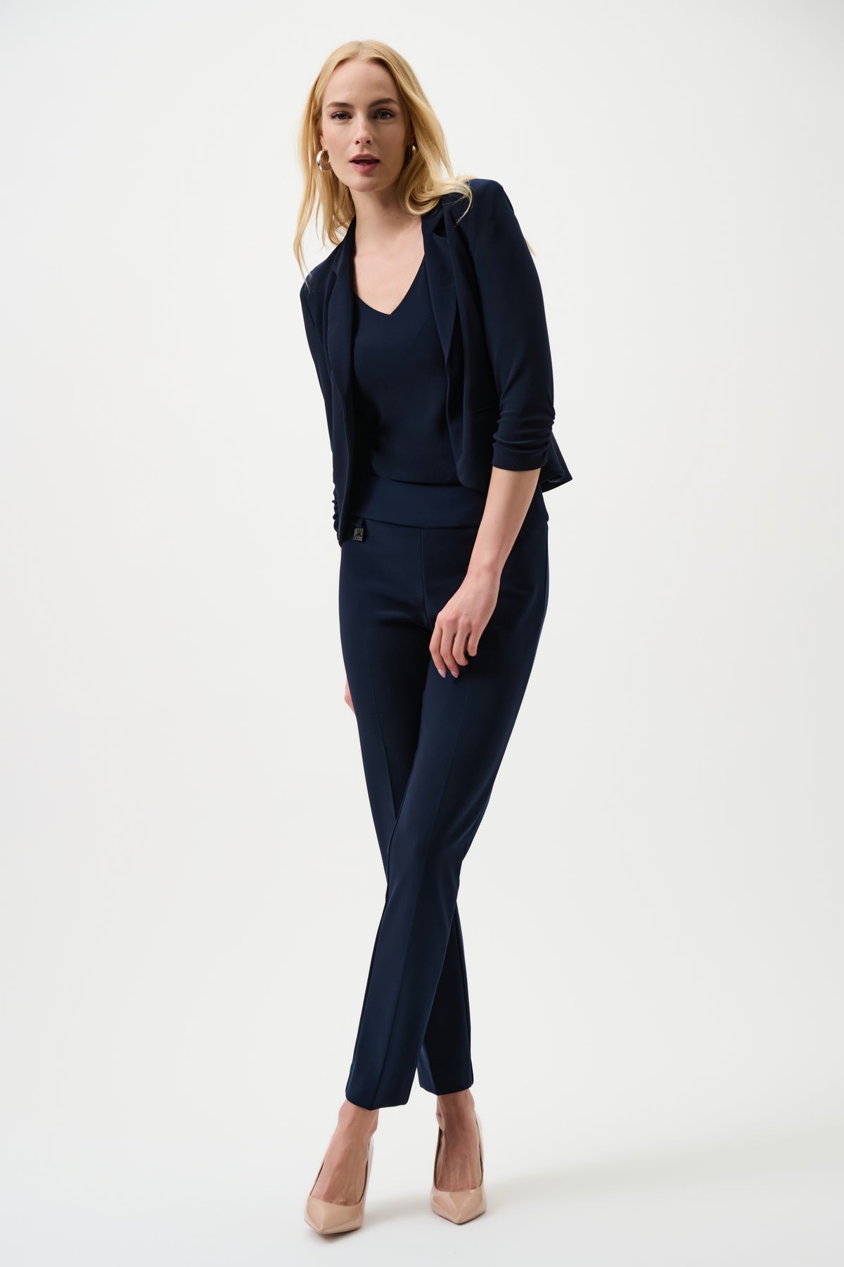 Introducing versatility at its finest, with this notched collar classic blazer. With the look and feel of an unstructured blazer, this cover-up can easily be paired with its matching pencil skirt, your favourite jeans, or sleek leather pants. Features faux front pockets and shirred 3/4 length sleeves for added detail.