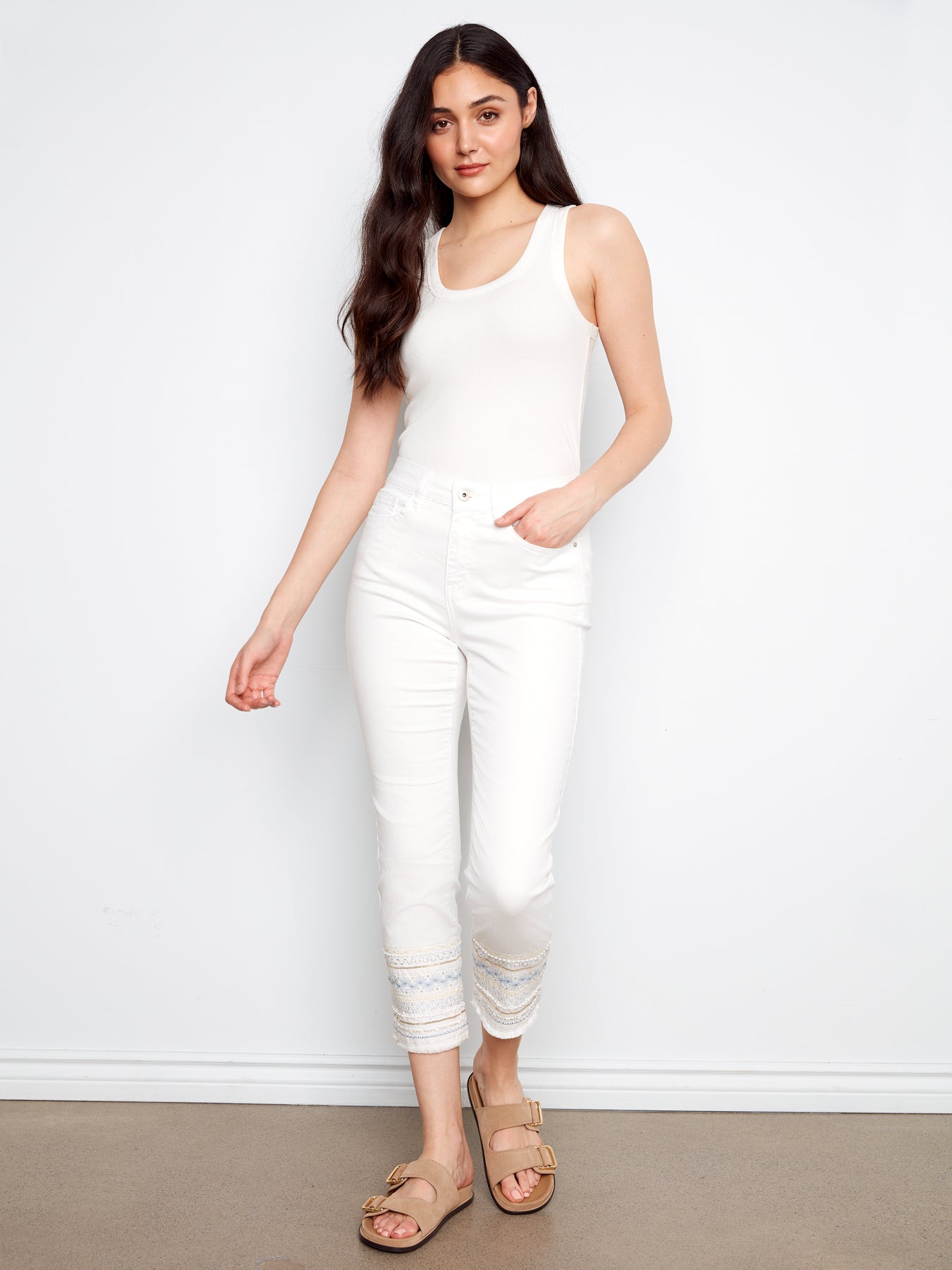 Ring Spun Denim Slim Pants With Hem Embroidery