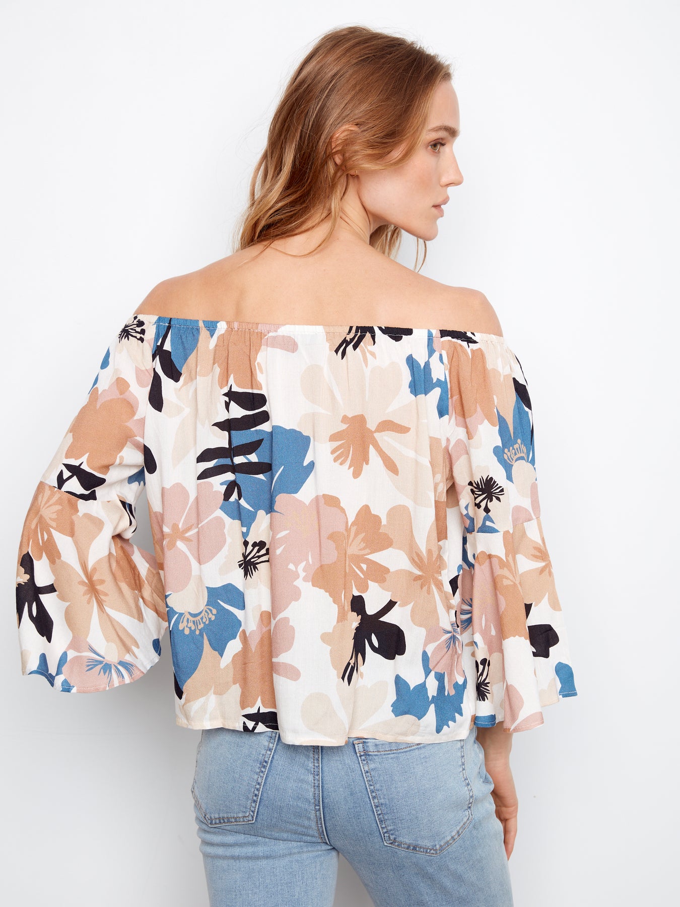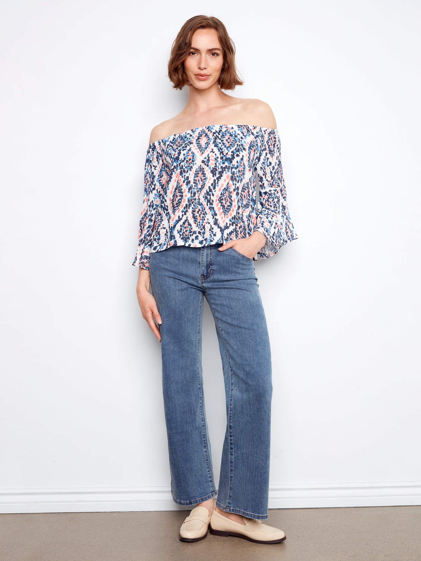Elegant off-shoulder blouse featuring vibrant prints and three-quarter sleeves. Perfect for casual outings or layered styling with contemporary flair.