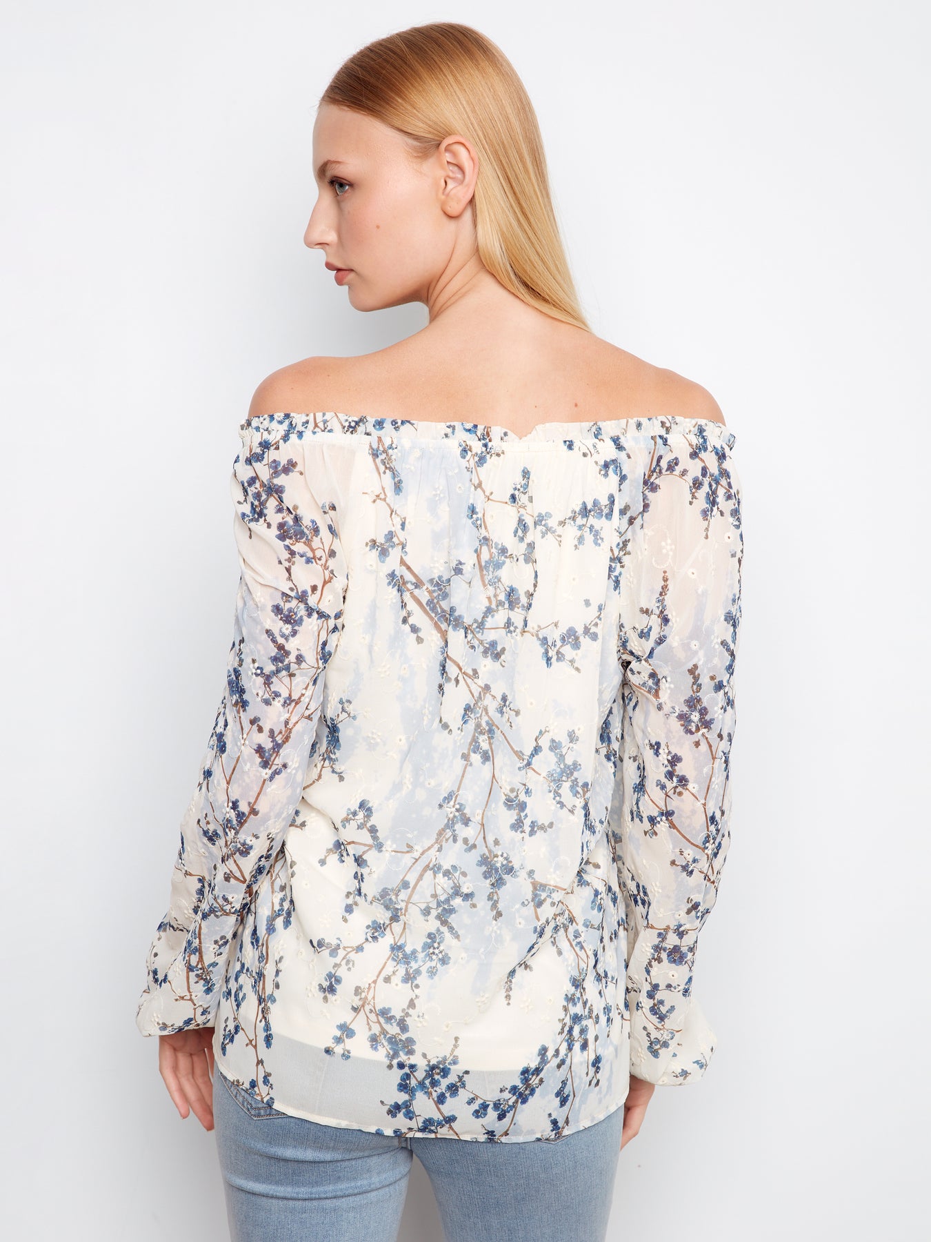 Printed Eyelet Long Raglan Balloon Sleeve Off Shoulder Blouse