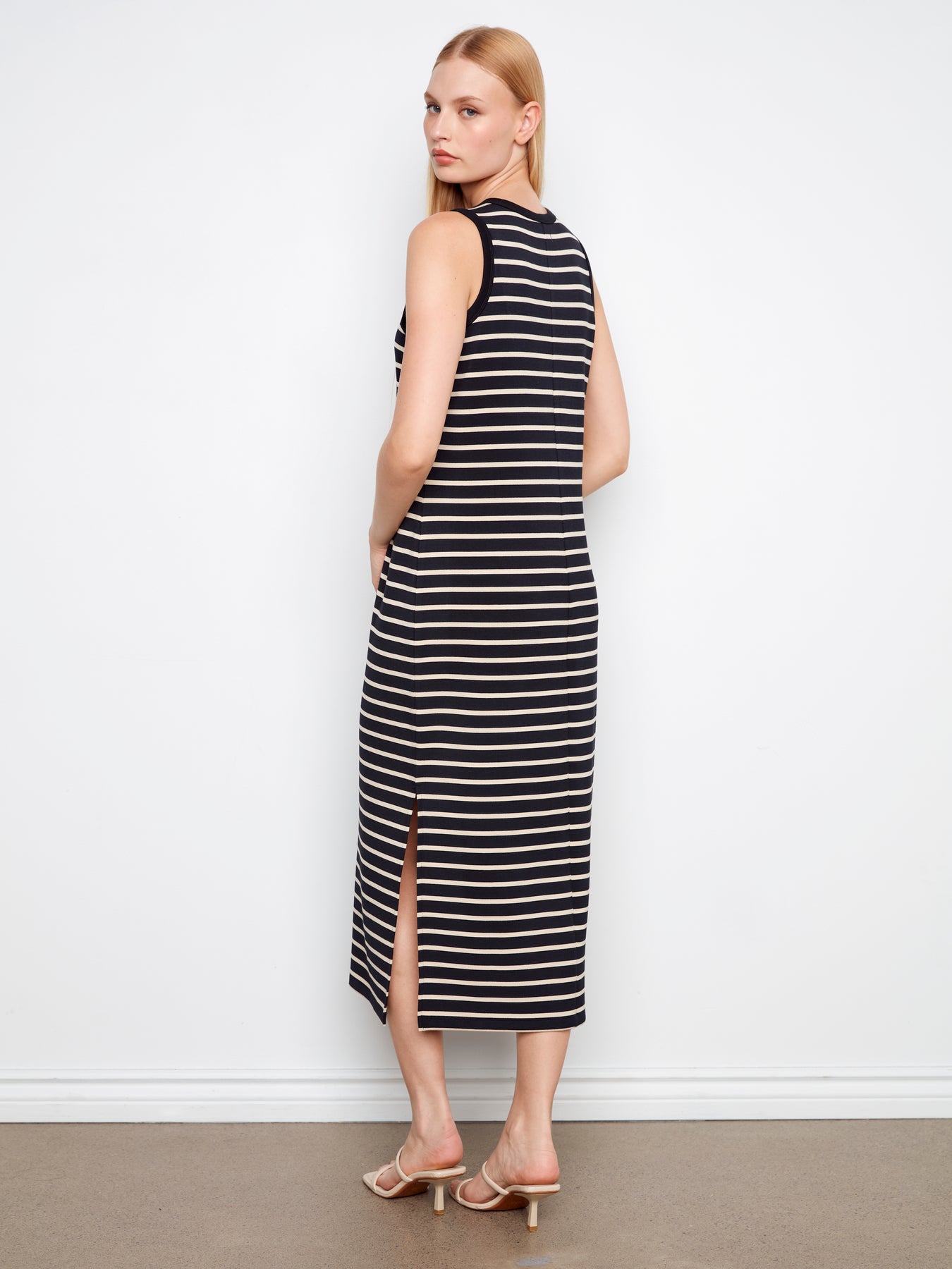 Engineered scuba fabric delivers superior stretch and recovery. Sleeveless silhouette with classic yarn-dye stripes offers versatile styling for any occasion.
