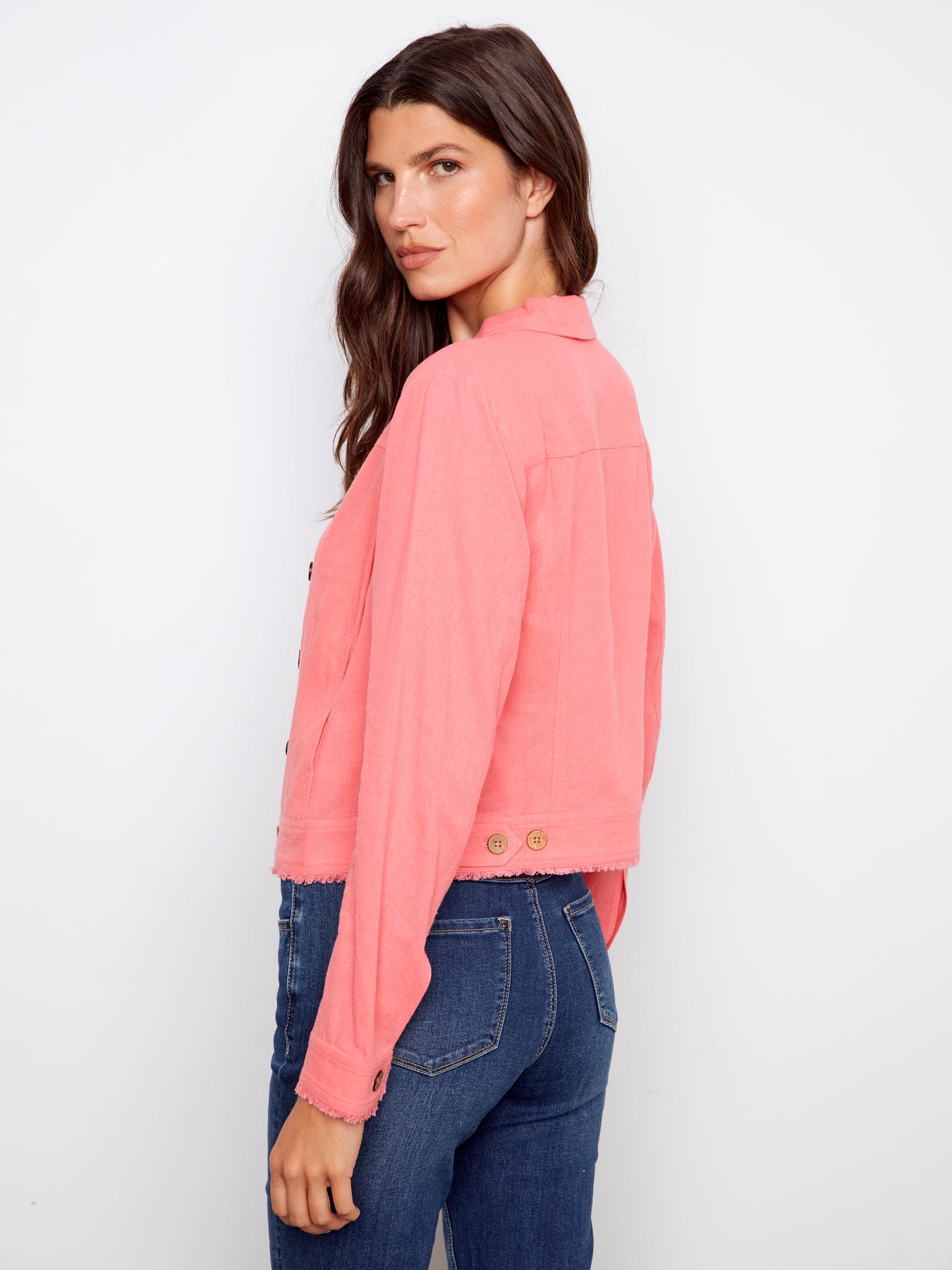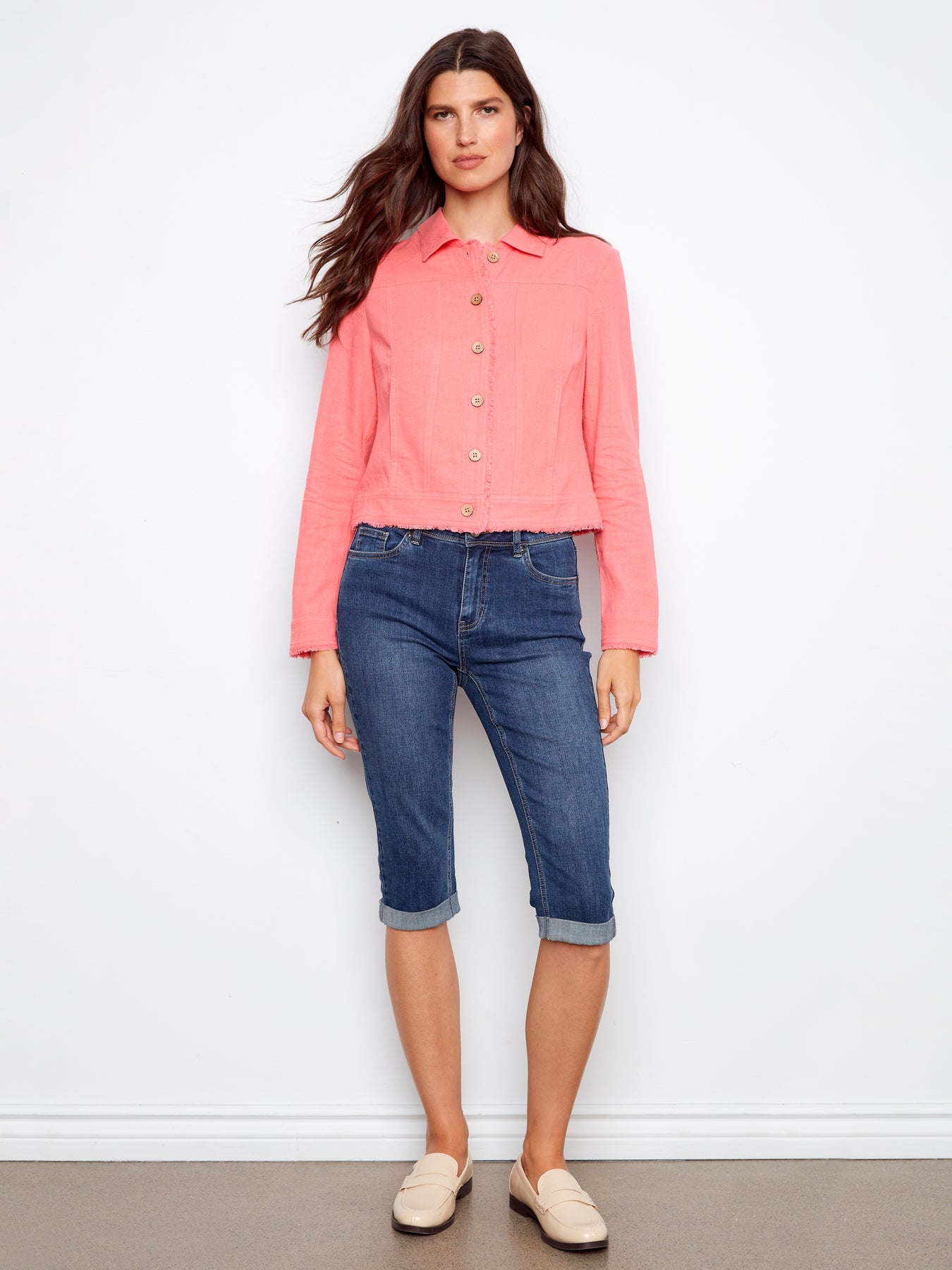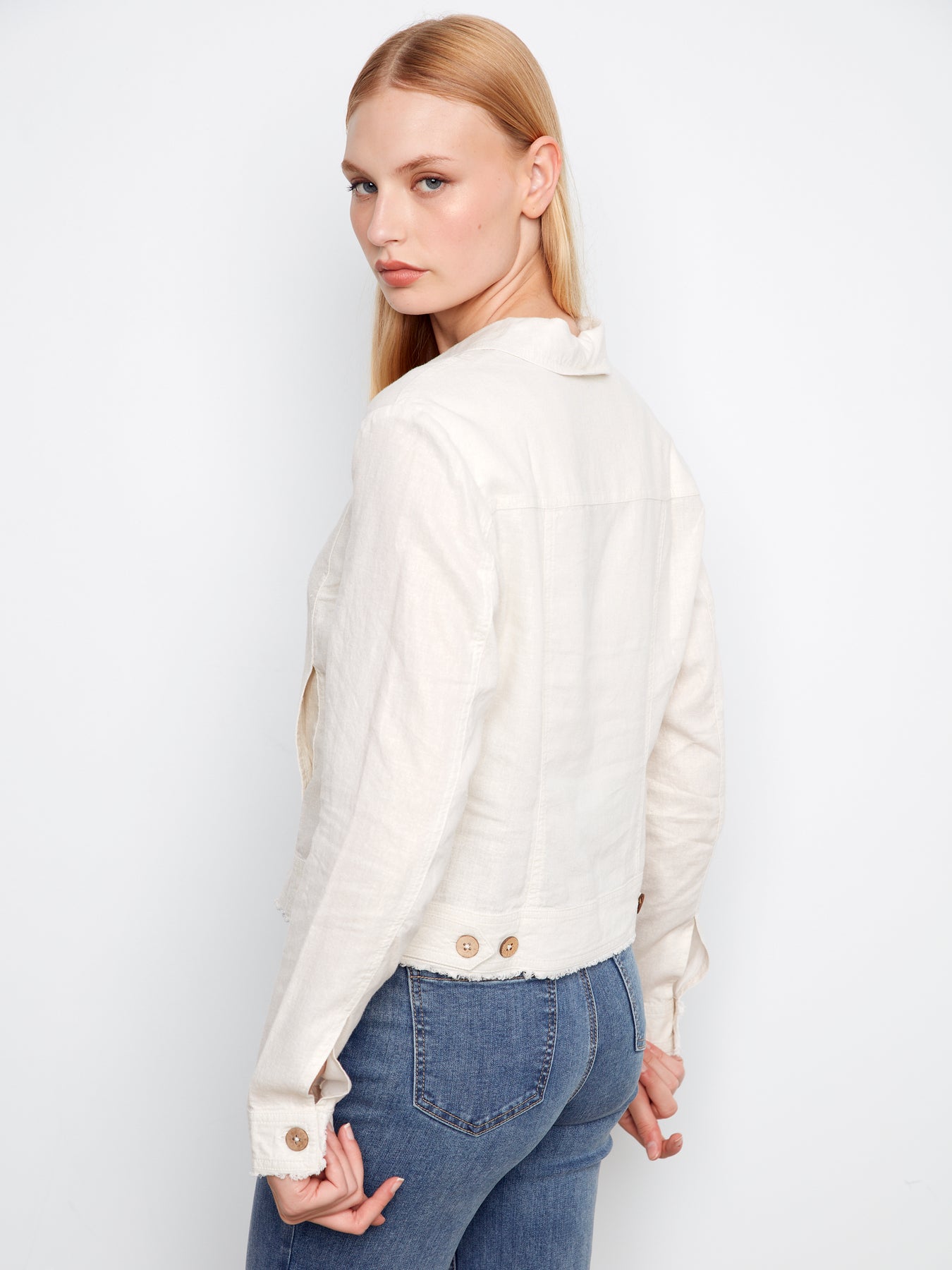 Lightweight linen jacket featuring a deliberately frayed hem for contemporary edge. Perfect for layering across seasons with effortless sophistication.