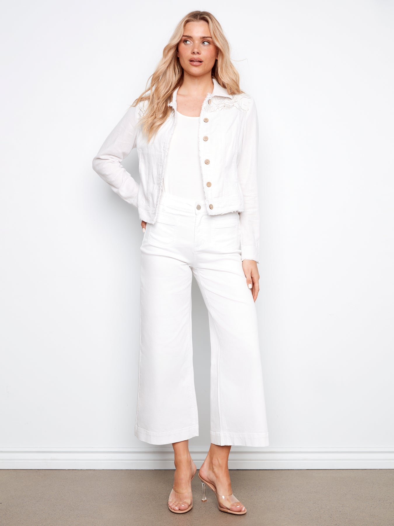 Linen Jacket Wth Embroidered Yoke And Frayed Hem