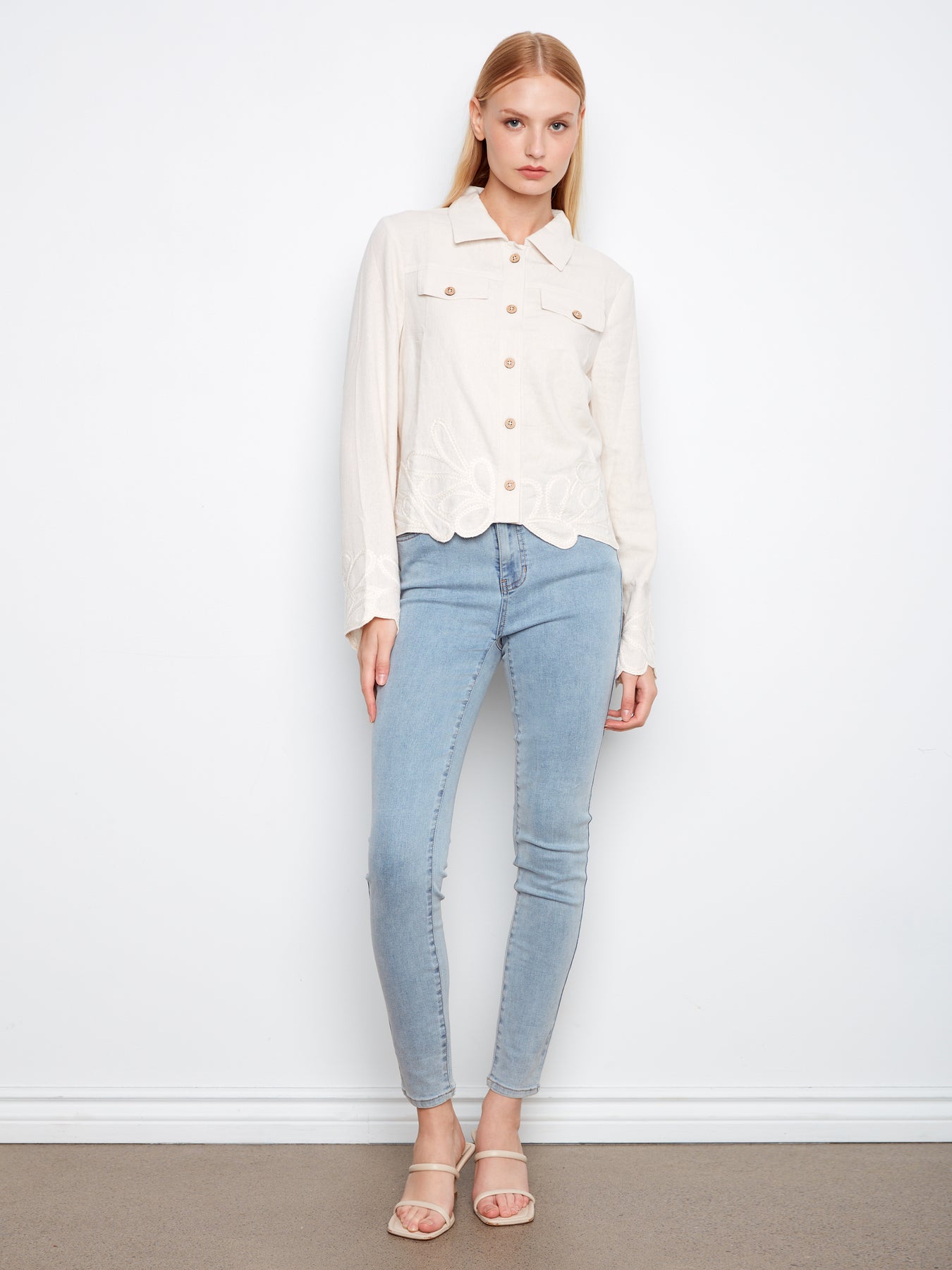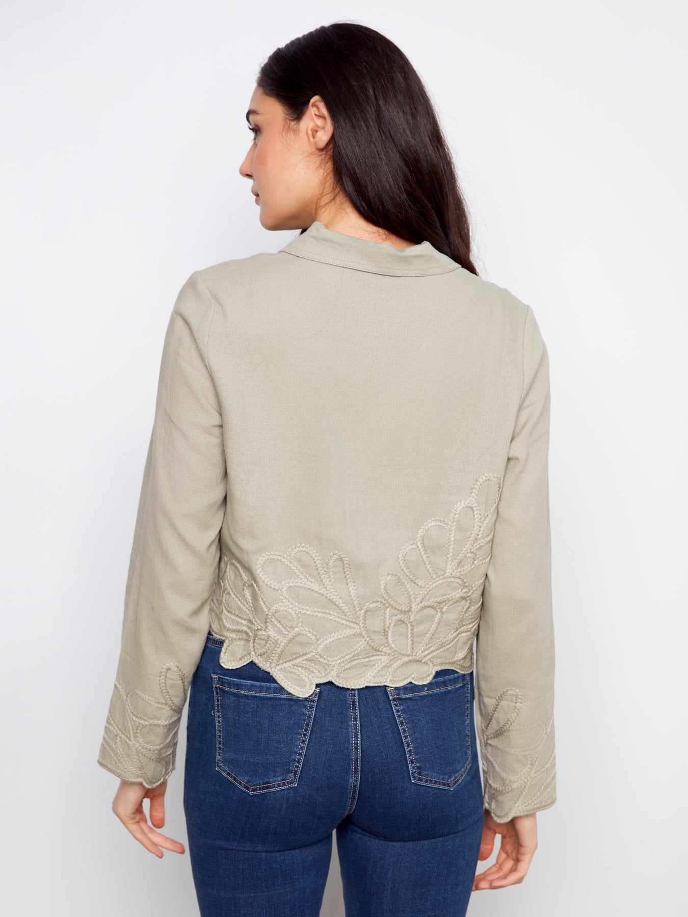 Lightweight linen jacket featuring intricate embroidered hem detailing. Breathable fabric ideal for warm seasons. Effortless sophistication for casual and refined occasions.