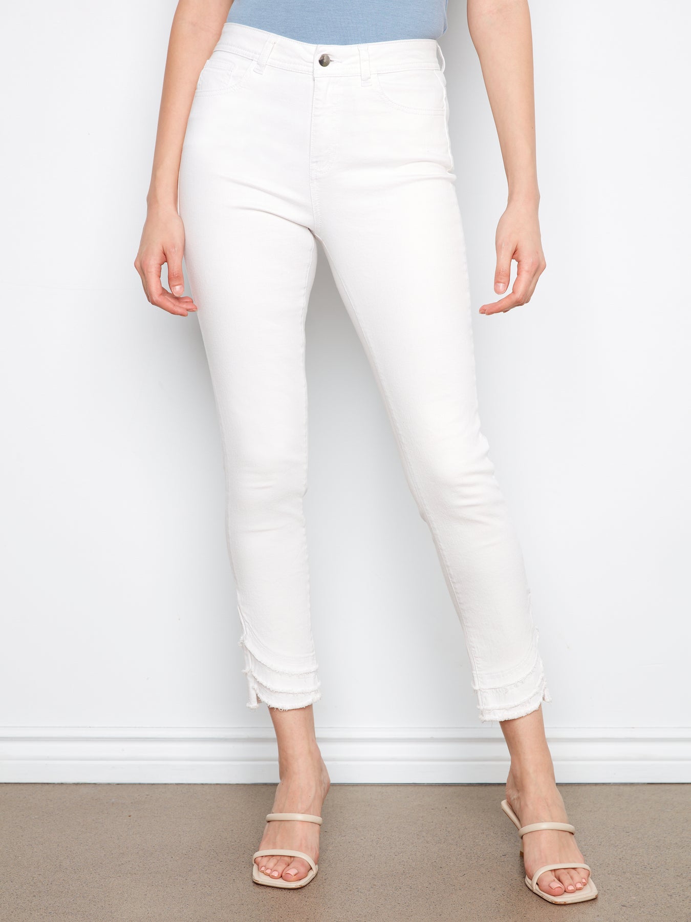 Premium colored twill skinny pants featuring a frayed hem detail. Structured fabric, flattering fit, versatile styling for any occasion.