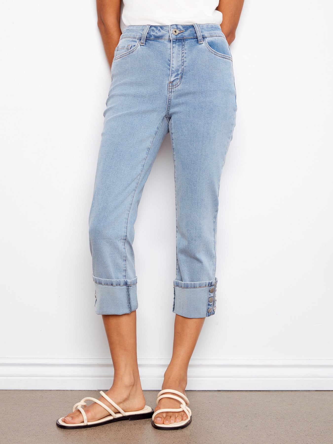 Stretch Denim Narrow Leg Pants With Cuff Snap Detail Hem