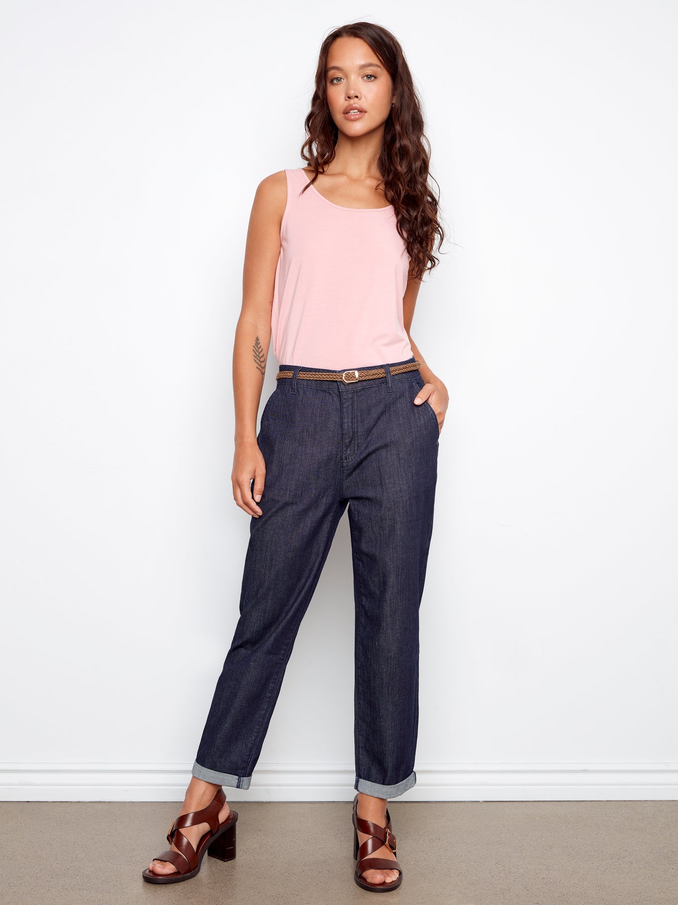 Structured denim with cross-hatch texture and tapered silhouette. Integrated belt detail adds definition. Versatile narrow-leg cut for contemporary styling.