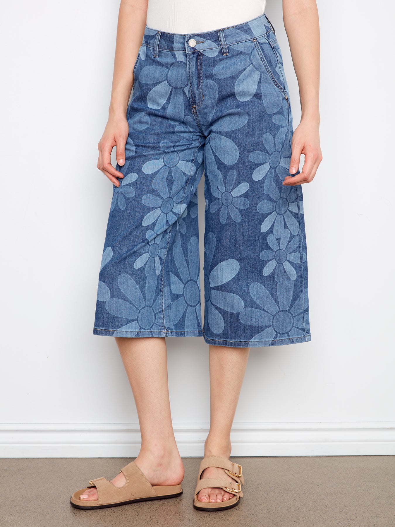 Cropped palazzo silhouette in stretch denim with bold printed details. Comfortable fit for contemporary styling with versatile appeal.