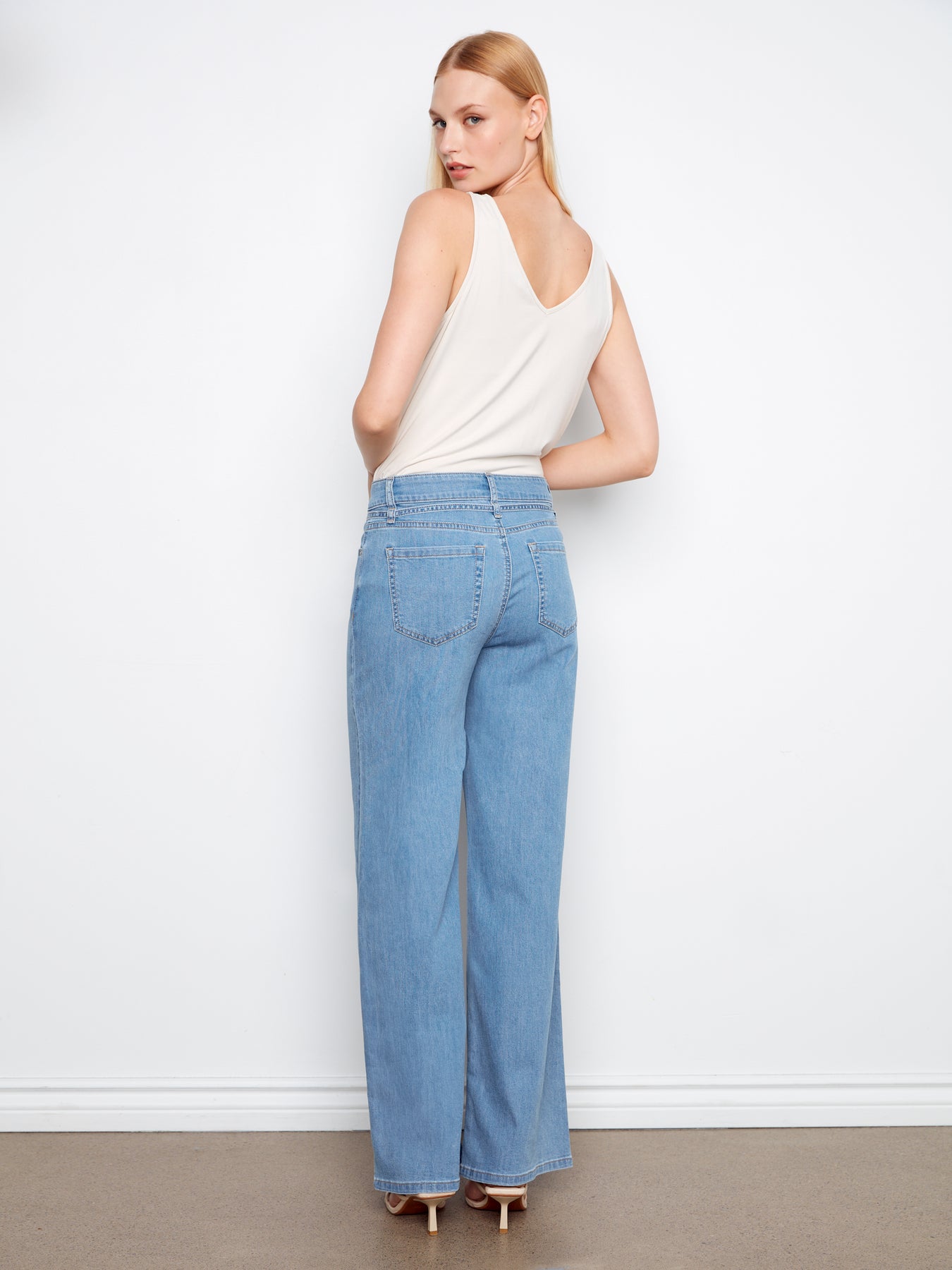 Expertly crafted wide-leg denim with premium stretch fabric and adjustable belt detail for effortless comfort and contemporary style.