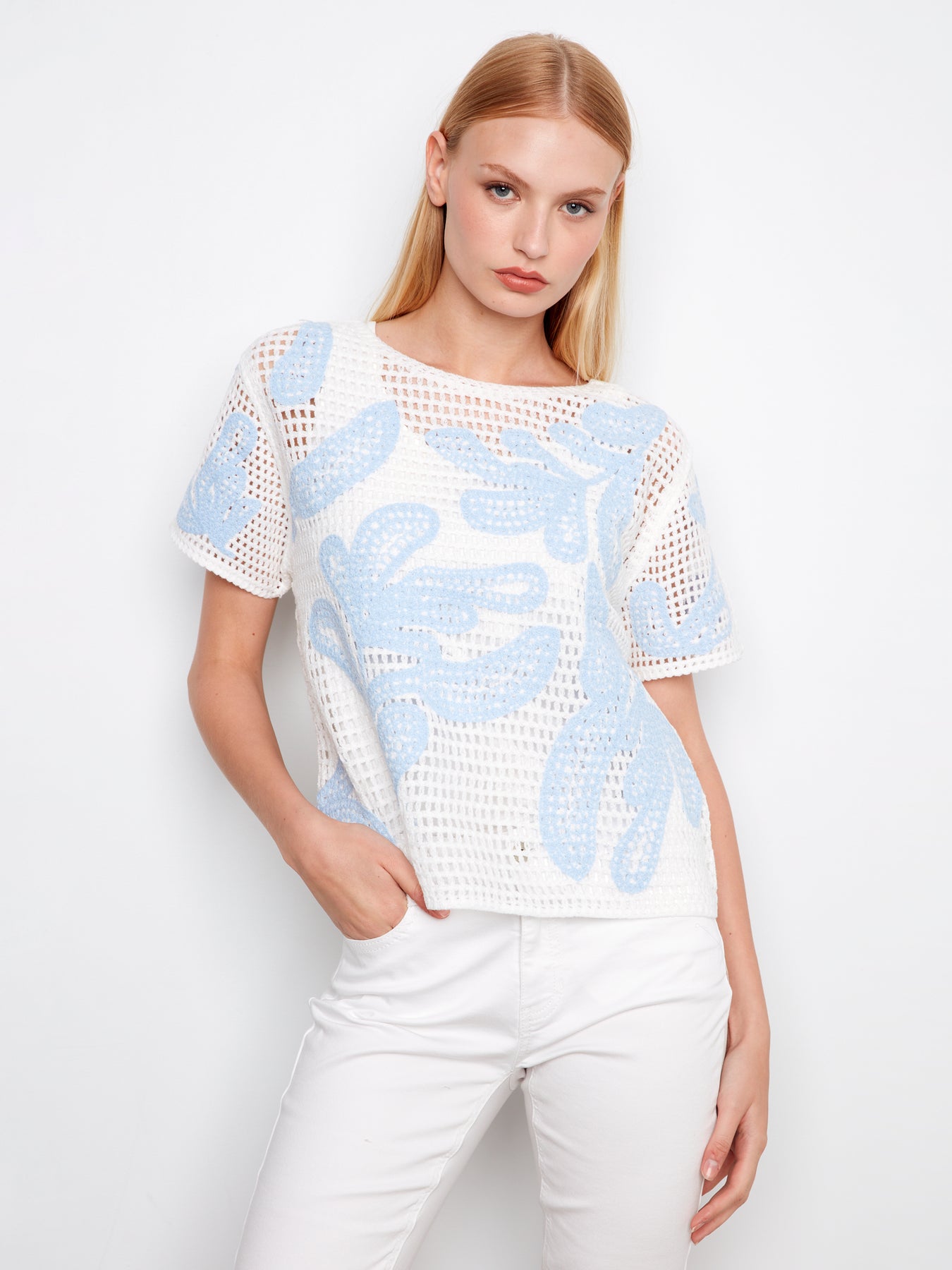 Handcrafted crochet sweater featuring an intricate leaf motif. Short sleeves offer breathable comfort for layering or warm-weather wear.