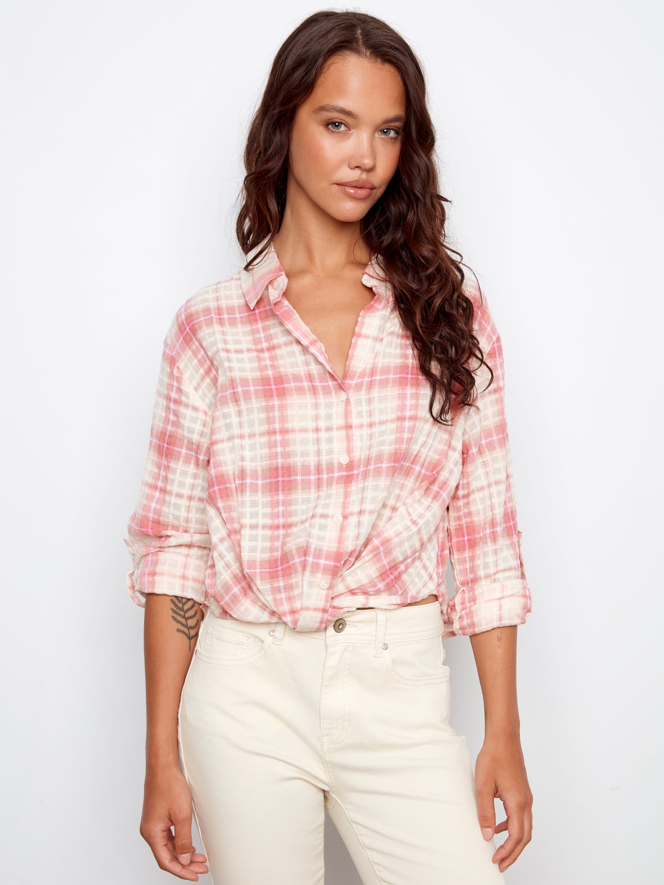 Sophisticated yarn-dyed cotton plaid shirt featuring a flattering twist front and versatile roll-up sleeves for effortless styling.
