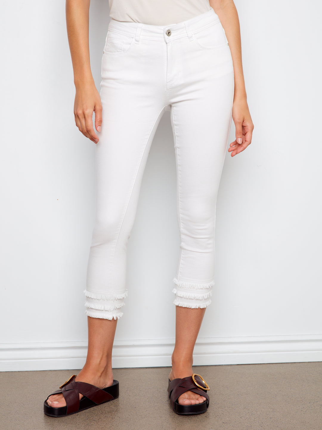 Colored Twill Cropped Skinny Pants With Frayed Hem Details