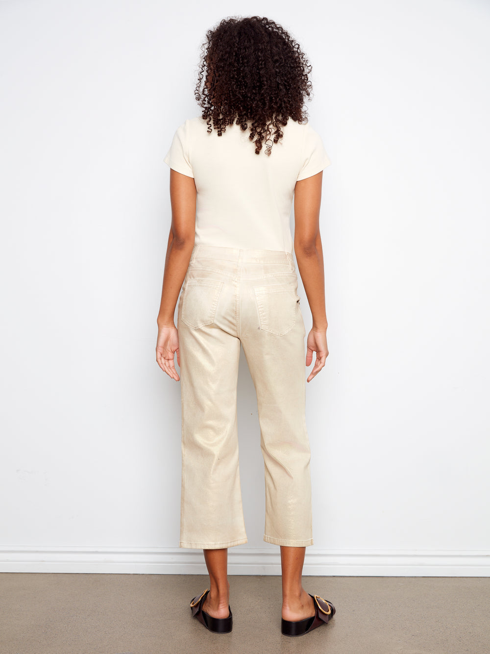 Foiled Twill Cropped Straight Leg Pants With Snap Buttons Patch Pockets
