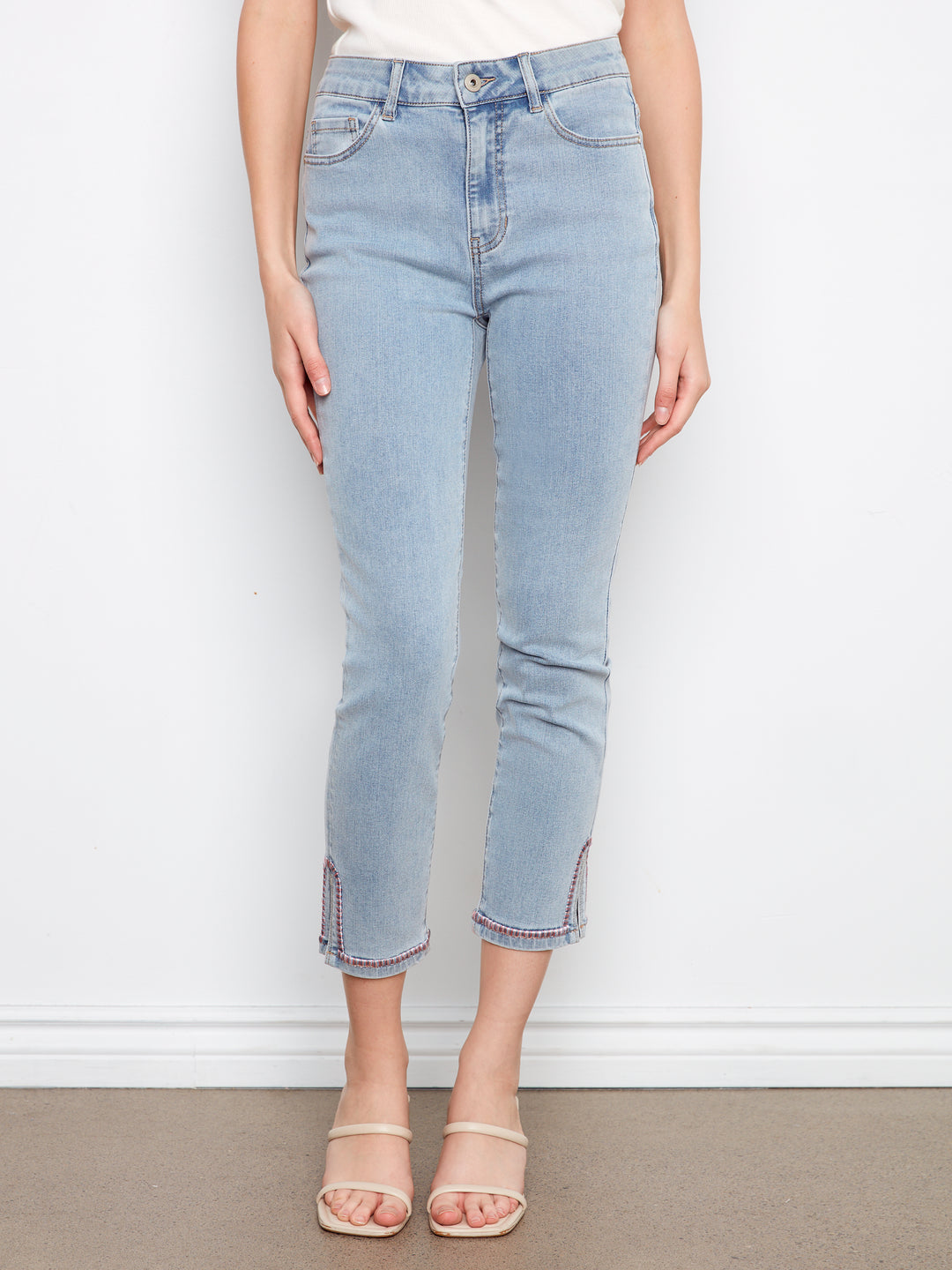 Stretch Denim Slim Leg Pants With Curved Embroidery Split At Hem