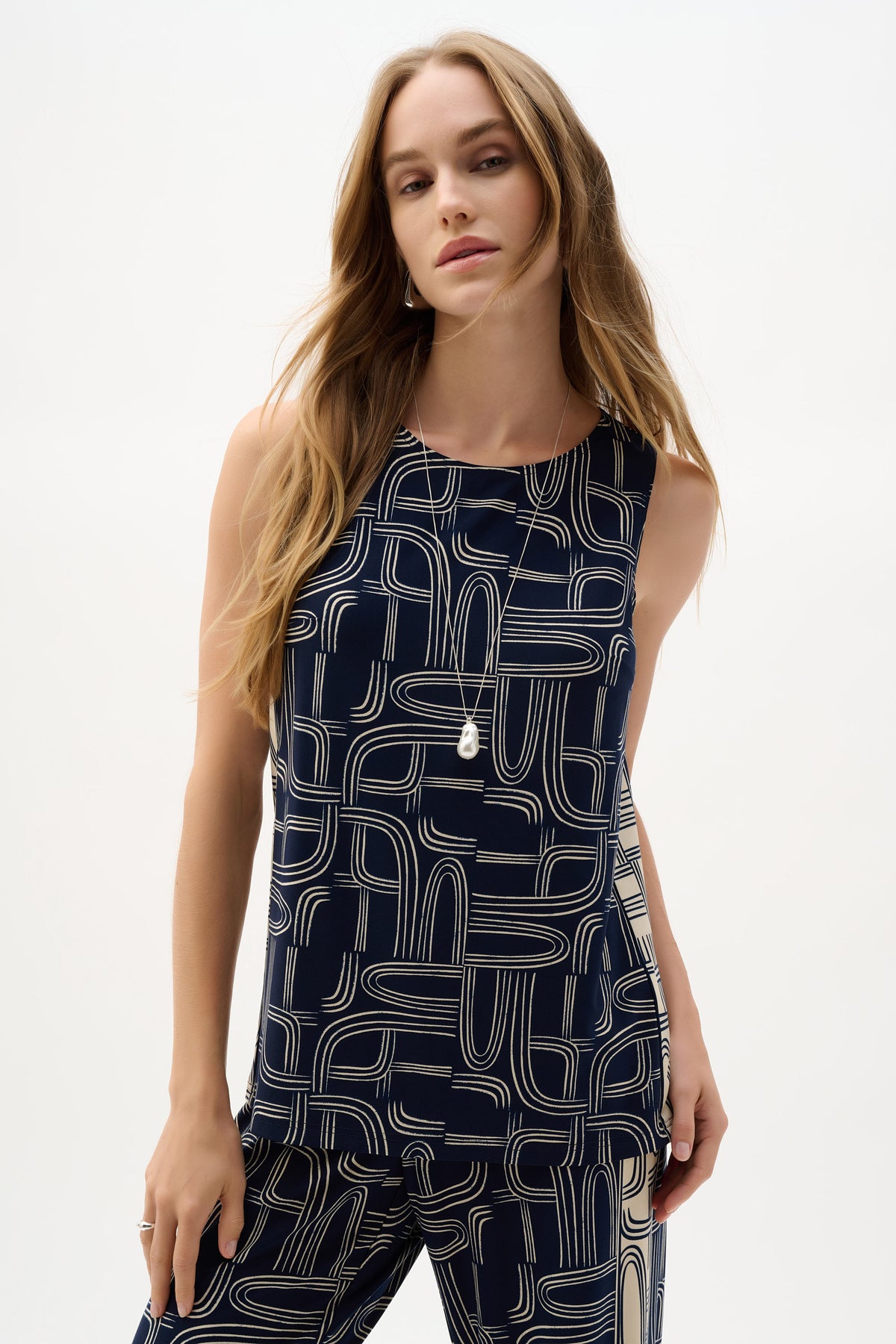 This silky knit straight top showcases a geometric print with sleek side panel placement for a refined shape. Designed sleeveless with a scoop neckline, it’s finished with a decorative center back button detail.
