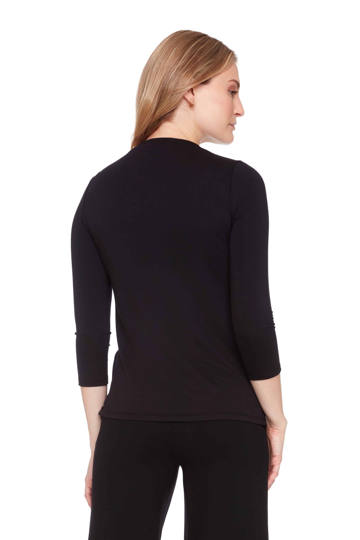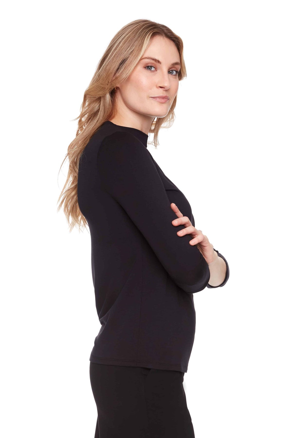 A sumptuously soft staple, this minimal must-have boasts an upscale elegance with strong demure vibes. The higher neckline is a stylish juxtaposition to the mid-length sleeves and streamlined cut, exuding a chic sophistication that feels timeless yet right on trend. Ultra-comfy and highly versatile, it’s a foundational essential that will inevitably become the hero of your fall lineup.