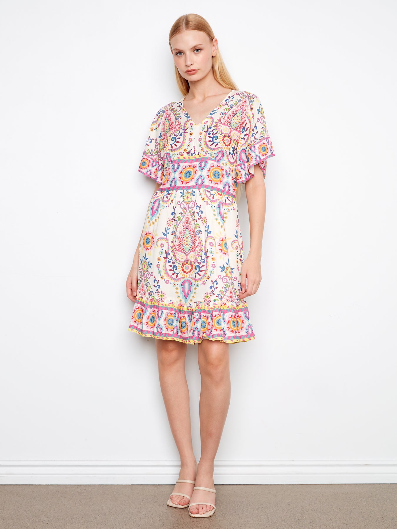 Border Print Flutter Elbow Sleeve V-Neck Dress, Back Smocked Waist Band
