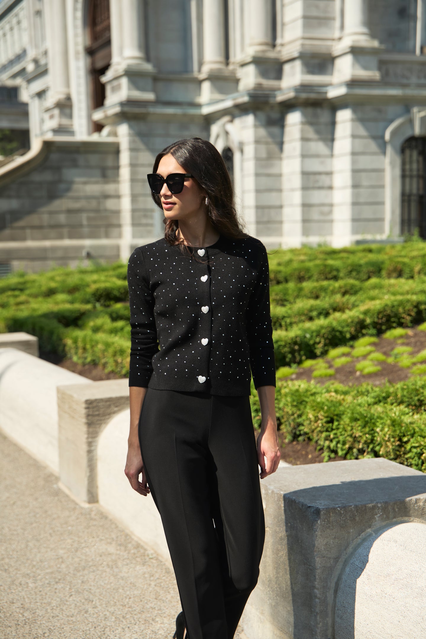 Imagine wrapping yourself in this chic black cardigan, expertly crafted from a luxurious blend of 52% rayon, 28% polyester, and 20% polyamide. The fabric drapes beautifully, providing a soft feel while allowing for ease of movement. Adorned with sparkling silver accents and heart-shaped buttons, this cardigan transforms a classic style into a show-stopping piece. Perfect for layering over a simple tee or dressing up with a sleek blouse, it seamlessly transitions from day to night.