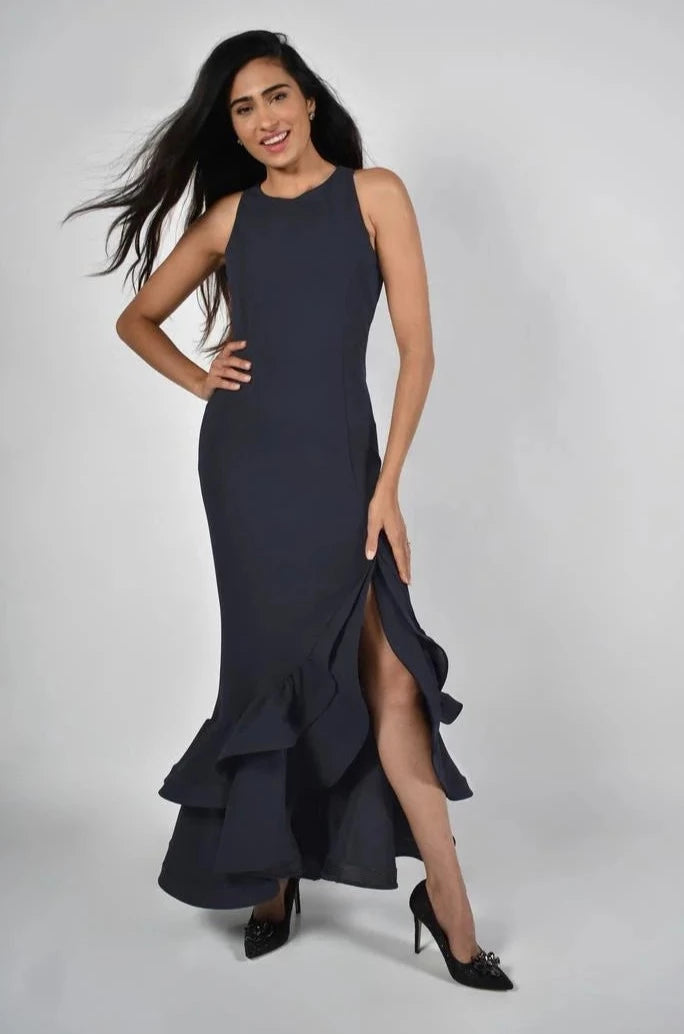 - Striking Design: The sleek silhouette features a dramatic ruffle hem that adds a touch of flair, while the thigh-high slit brings a hint of allure, ensuring you turn heads at every event.