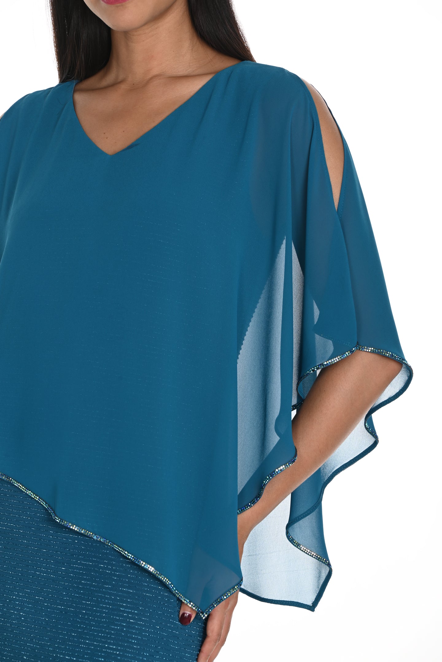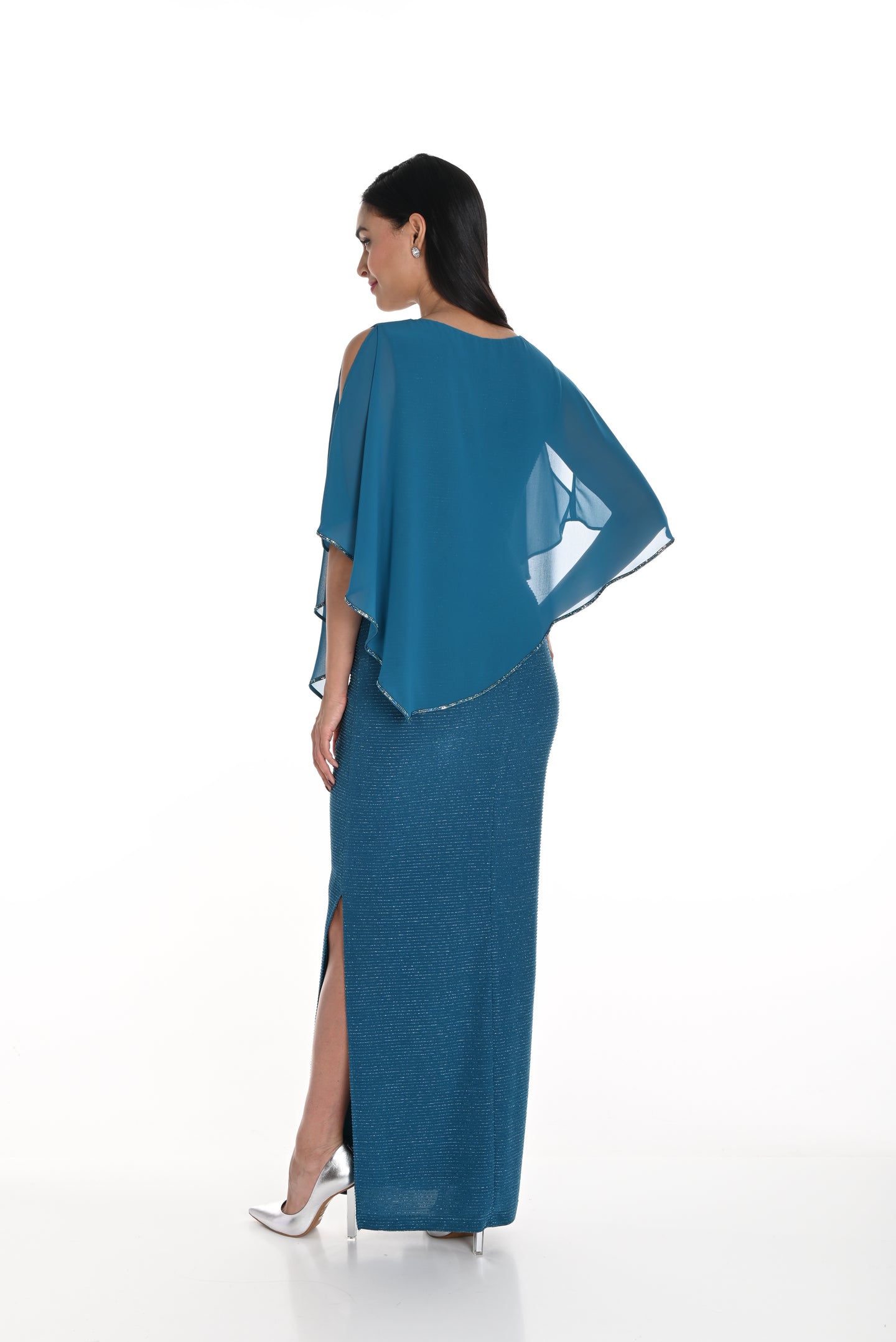 Crafted from a blend of 83% polyester, 12% metallic, and 5% elastane, this dress offers a comfortable fit with just the right amount of stretch. The captivating teal/blue color is enhanced by shimmering metallic threads, adding an extra layer of refinement. The chic cape-style top, with its elegant flow and subtle bead detailing along the edges, creates a timeless silhouette that drapes effortlessly over the body. The skirt features a smooth, form-fitting design that balances the top perfectly, giving you a look that is both modern and classic.