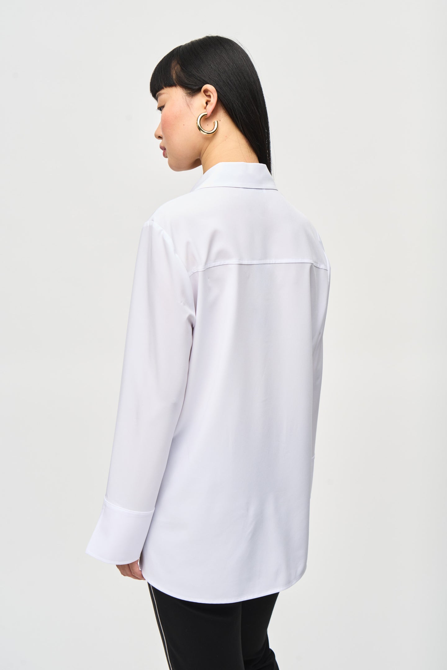 Embrace casual elegance with the Joseph Ribkoff Woven Button-Down Blouse 243958. This relaxed yet sophisticated top offers a modern take on the classic boyfriend shirt, making it a versatile addition to your everyday wardrobe.