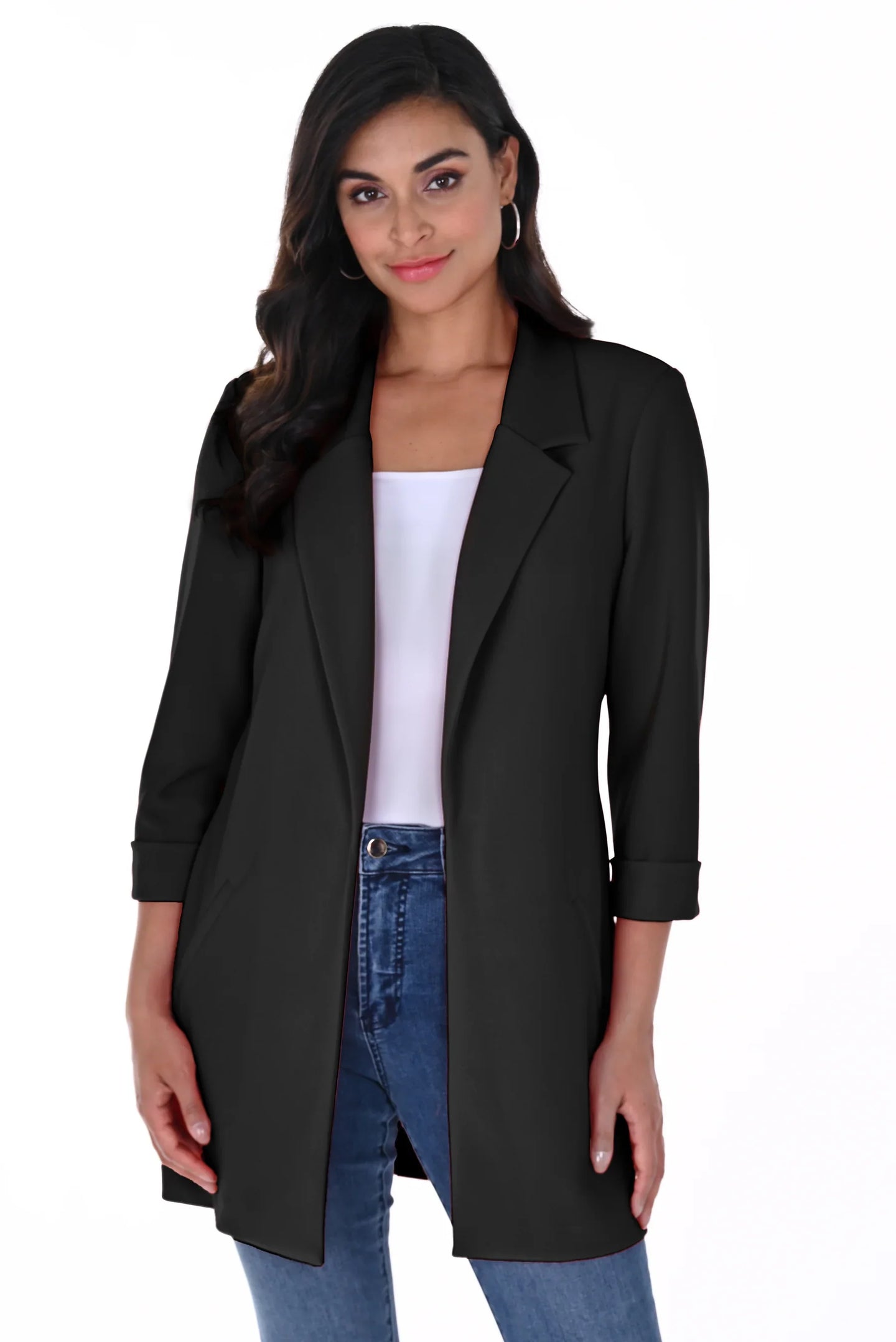 Please note: This blazer is made from a blend of polyester and elastane and features a longline hem, wide folded point collar, three-quarter length sleeves, and a minimalist design with no pockets or zipper.