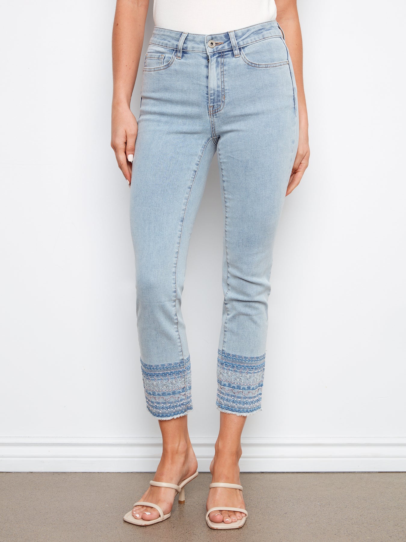 Stretch Denim Slim Pants With Hem Embroidery