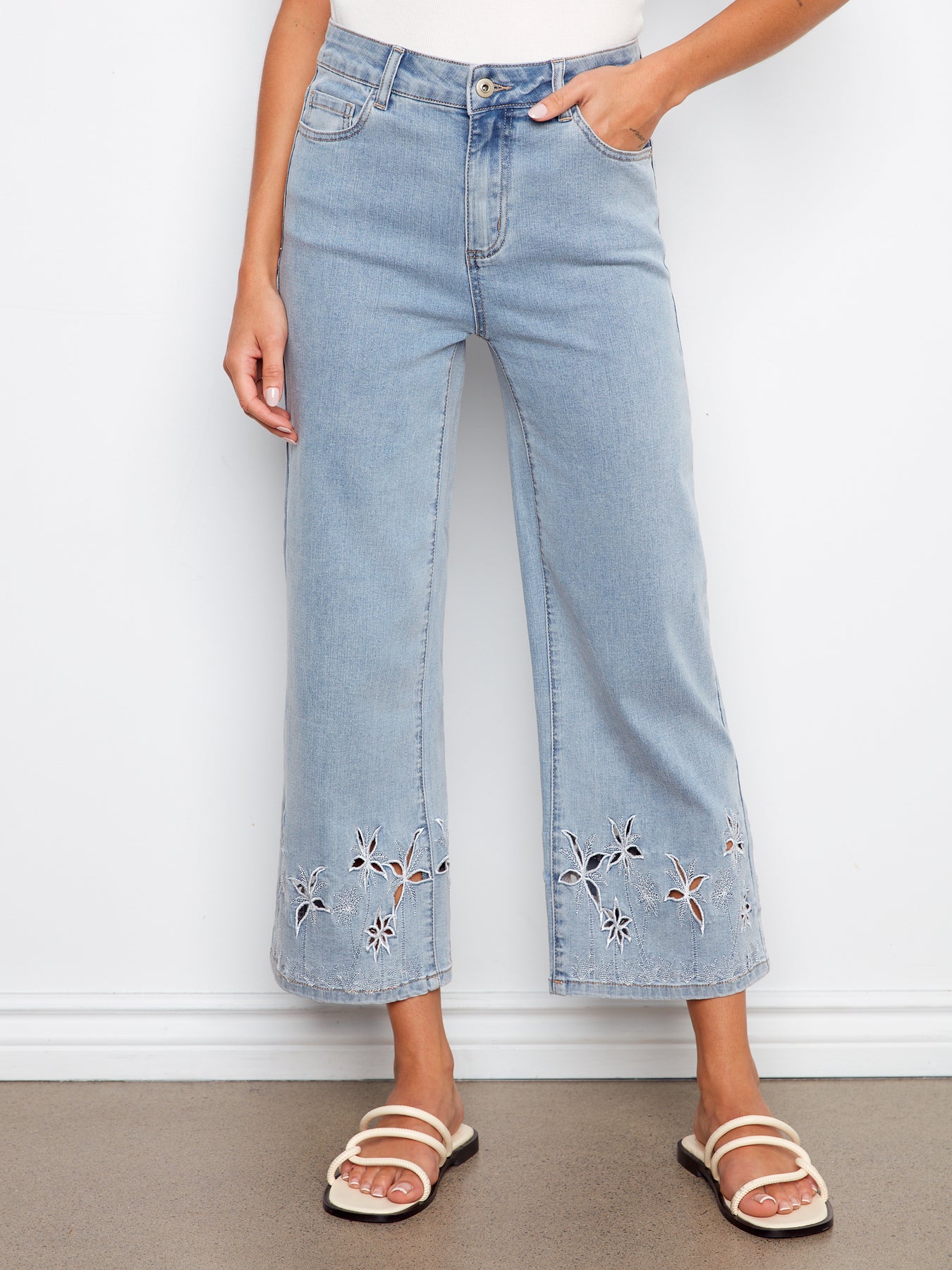 Expertly crafted stretch denim flares featuring intricate palm tree embroidery at the hem. Comfortable, flattering fit with vintage-inspired silhouette.