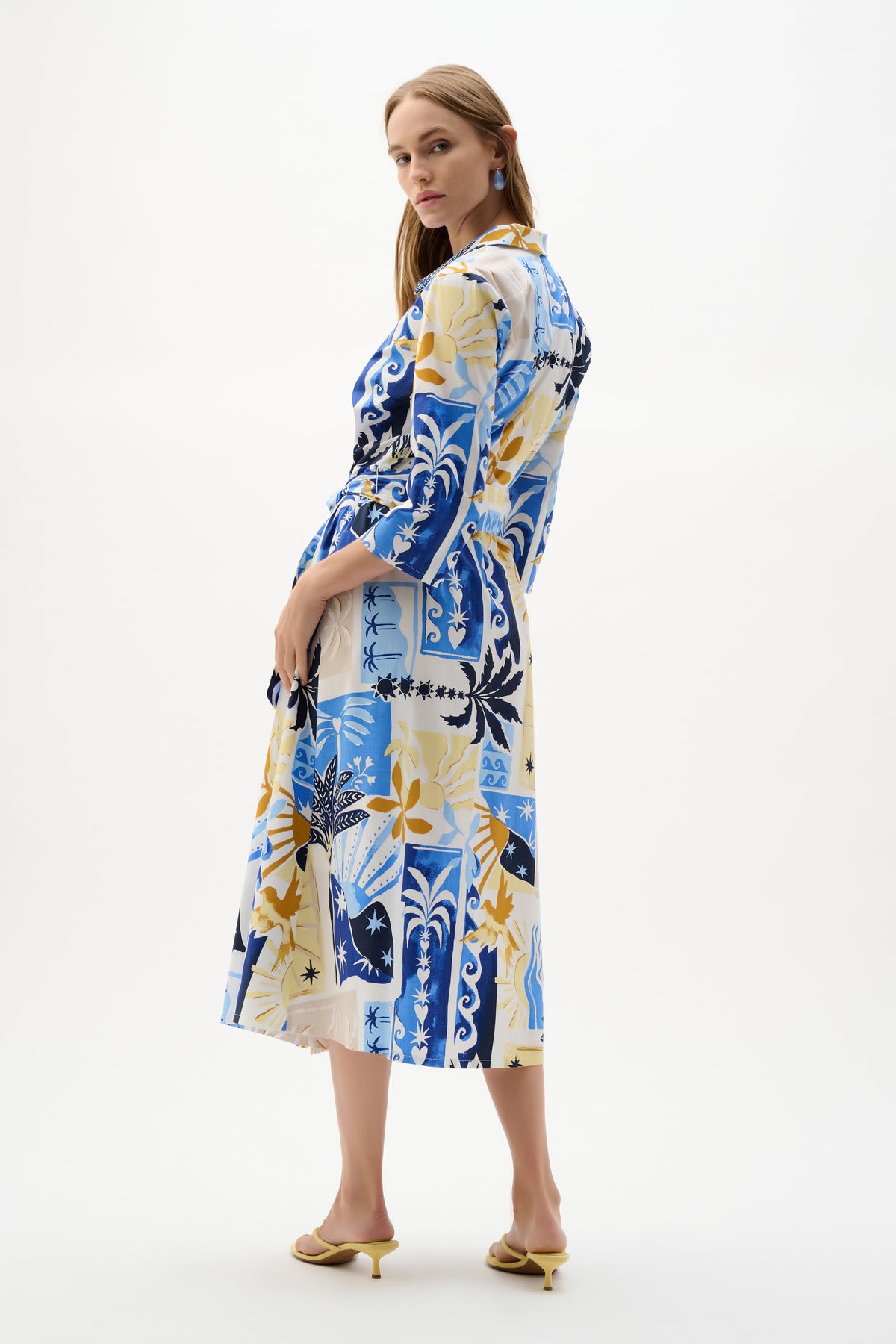This cotton poplin A-line wrap dress blooms with a tropical print and refined wrap silhouette. Three-quarter sleeves balance the flow, while a waist sash with button detail cinches the shape. Effortless and versatile for day-to-night moments.