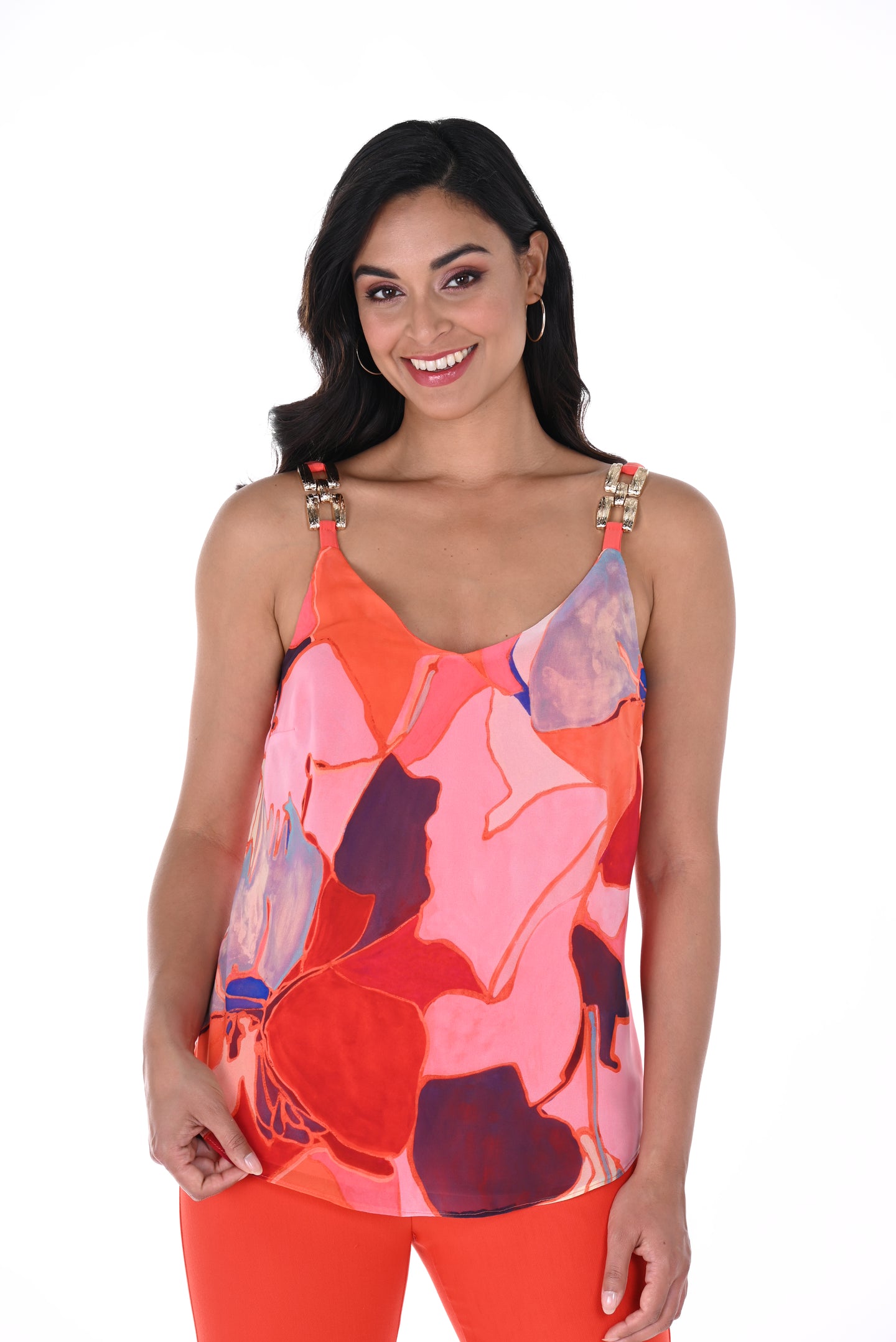 Step into the season with flair in the stunning Frank Lyman Top (Style 246143). Crafted from 100% lightweight polyester, this eye-catching piece features a lively orange and pink color palette, perfect for adding a pop of color to any outfit.